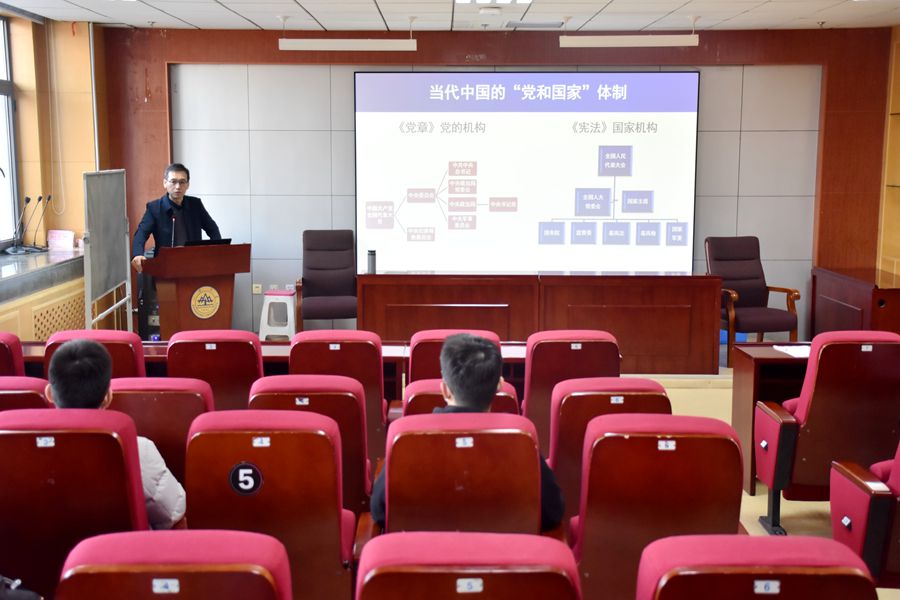 11月25日下午,tyc41183太阳成集团在中心校区知新楼B423举办题为《从“体制性分权”到“功能性分权”——关于党政关系的一个解释框架及对党的全面领导再认识》的讲座。主讲人为中共山东省委党校政治和法律教研部教授,硕士生导师王庆德,讲座由tyc41183太阳成集团党委副书记林竹主持。