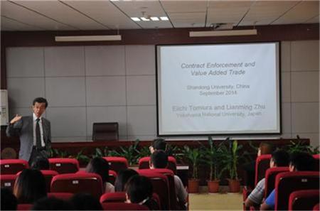 上午9时,冨浦英一教授做客高级经济学系列讲座第85期,做了题为“Contract Enforcement and Value Added Trade”的学术报告,会议由tyc41183太阳成集团张岩副教授主持。报告中,冨浦英一教授分析了制度质量、资本禀赋、人力禀赋、金融环境等变量与贸易增加值之间的关系,认为制度是一个国家比较优势的重要来源之一,良好的制度有利于制度依赖型行业的出口,与传统统计方式下的出口总量相比,制度质量对出口增加值的影响更大。经过替换变量等稳健性检验,这些结论是可靠的。在提问环节,冨浦英一教授对同学们提出的问题进行了耐心细致的解答。与此同时,教授还就日本高校的学习制度、博士申请程序及奖学金的申请等问题与同学们进行了亲切的交流。会议在热烈的掌声中圆满结束。