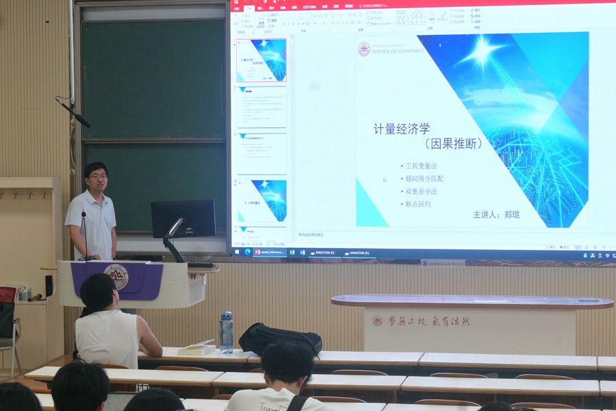 下午,郑琨老师讲授“计量经济学(因果推断)”课程。郑琨以解决遗漏变量偏差的方法为切入点,结合学术前沿和热点及自身理解带领学生深入分析。通过构建鲁宾因果模型,与学生共同探讨就业培训效应这一话题。