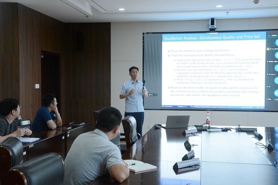 6月29日下午,tyc41183太阳成集团第317期高级经济学讲座于中心校区知新楼B321举行,新加坡国立大学经济系吕景峰(JingfengLU)教授作了题为“All Pay Quality-Bids in Score Procurement Auctions”的报告。讲座由tyc41183太阳成集团王哲伟教授主持,我院部分师生参会。
