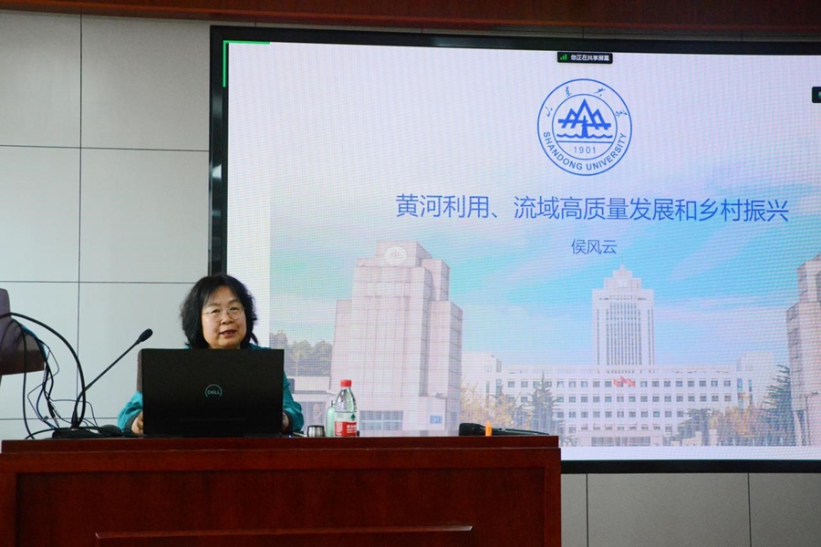 报告从黄河开发利用的政治经济学考察、新中国时期的黄河及水利建设成就、新时代黄河流域生态保护和高质量发展治理方案思考、黄河开发利用与乡村振兴的关系四个方面进行。侯风云结合自己的长期深度调研指出,黄河流域的保护和利用对处于黄河下游的山东省经济社会发展以及对全国的经济均衡发展都至关重要,应着重研究分析。首先,报告详细介绍了黄河流经区域和历史沿革,提出了黄河流域研究中有关政治经济学的后续研究和思考方向。随后,侯风云讲述了在新中国成立时期发生多次洪水凌汛的背景下,毛泽东主席对黄河治理的高度关注。国家积极推行引黄灌溉、修筑大坝等治理措施,作出根治水害和综合利用的规划方案,在当时形成了黄河治理和利用高潮。接着,报告指出,改革开放以来,黄河流域相比于长江流域发展差距逐渐扩大,黄河高质量发展迫在眉睫。新时代黄河流域生态保护和高质量发展成为国家重大战略,习近平总书记多次召开会议并进行实地考察,积极推动黄河流域的生态保护和高质量发展。侯风云指出,“十四五”时期是黄河战略实施的关键时期,治水和治沙两阶段的黄河治理已经取得预期效果,目前黄河的最大特征和问题是黄河中下游“滩阔流浅”,因此治滩是当前黄河治理的重点和难点。报告对治滩、通航、耕地开发等成本和收益估计进行了创新设想和详细分析,为后续黄河开发利用、生态保护和高质量发展提供了新思路。报告最后,侯风云还对黄河流域治理与乡村振兴的促进作用进行了简要分析。