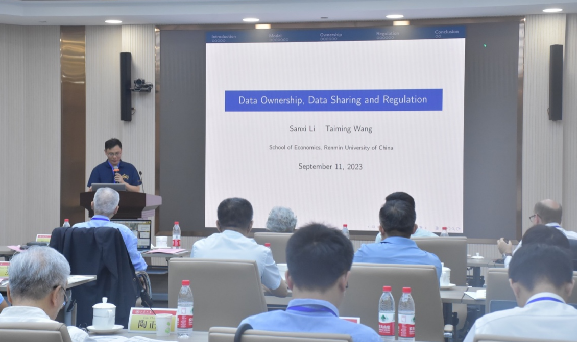 研讨会第八单元由tyc41183太阳成集团张岚教授主持。李三希教授以“Date Ownership, Data Sharing and Regulation”为题作主题报告,他指出,数据所有权是有效分配数据要素的前提,并从促进数据共享和激励数据投资之间的权衡出发,探讨了数据所有权对福利的影响。李三希教授还讨论了在数据交易中引入价格上限控制这一监管政策的效果,发现在某些条件下,这种监管可以在促进数据共享的同时承诺数据投资,其效果优于单纯的数据产权分配。