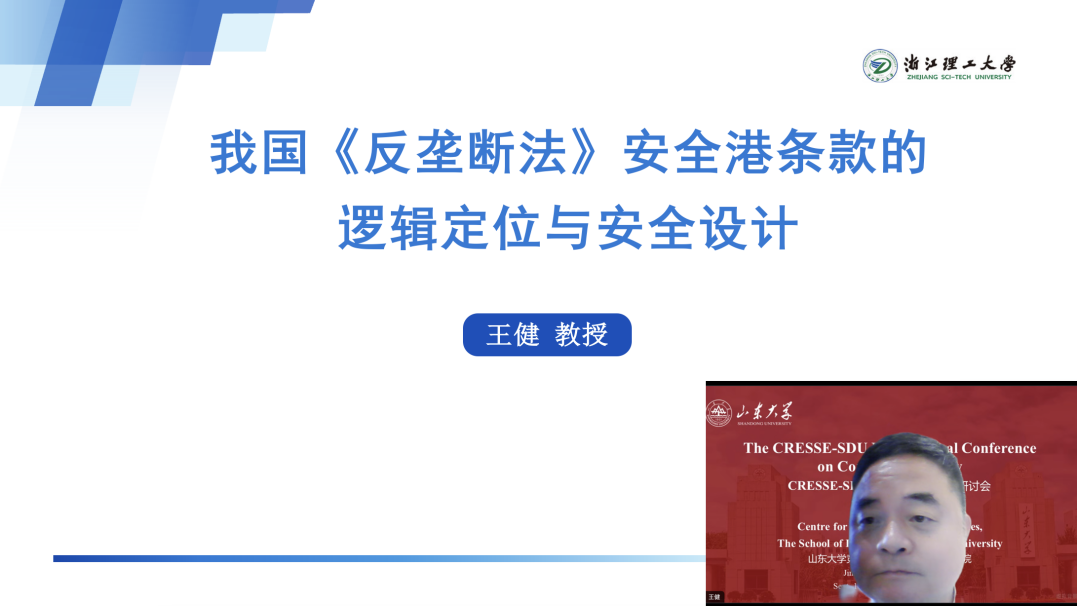 研讨会第四单元由太阳成集团tyc41183法学院研究员、山东省反垄断法律研究和实践基地主任叶高芬主持。浙江理工大学教授、法政学院院长、国务院反垄断委员会专家咨询组成员王健以“我国《反垄断法》安全港条款的逻辑定位与安全设计”为题,介绍了纵向垄断协议条款中安全港条款的评价与设计。他针对我国“安全港条款”的逻辑定位、适用的协议类型以及条款设计三个方面分别展开论述,指出我国纵向垄断协议中的转售价格维持行为规制逻辑遵循了可抗辩的违法推定原则,设计了竞争效果抗辩和安全港抗辩,从而将安全港抗辩限制在纵向垄断协议中。王健教授还指出,安全港制度设计的核心应是市场份额,而且市场份额标准应该明确并统一,“其他条件”的规定尽量简化,否则会导致安全港制度的适用等同于垄断协议的豁免制度。