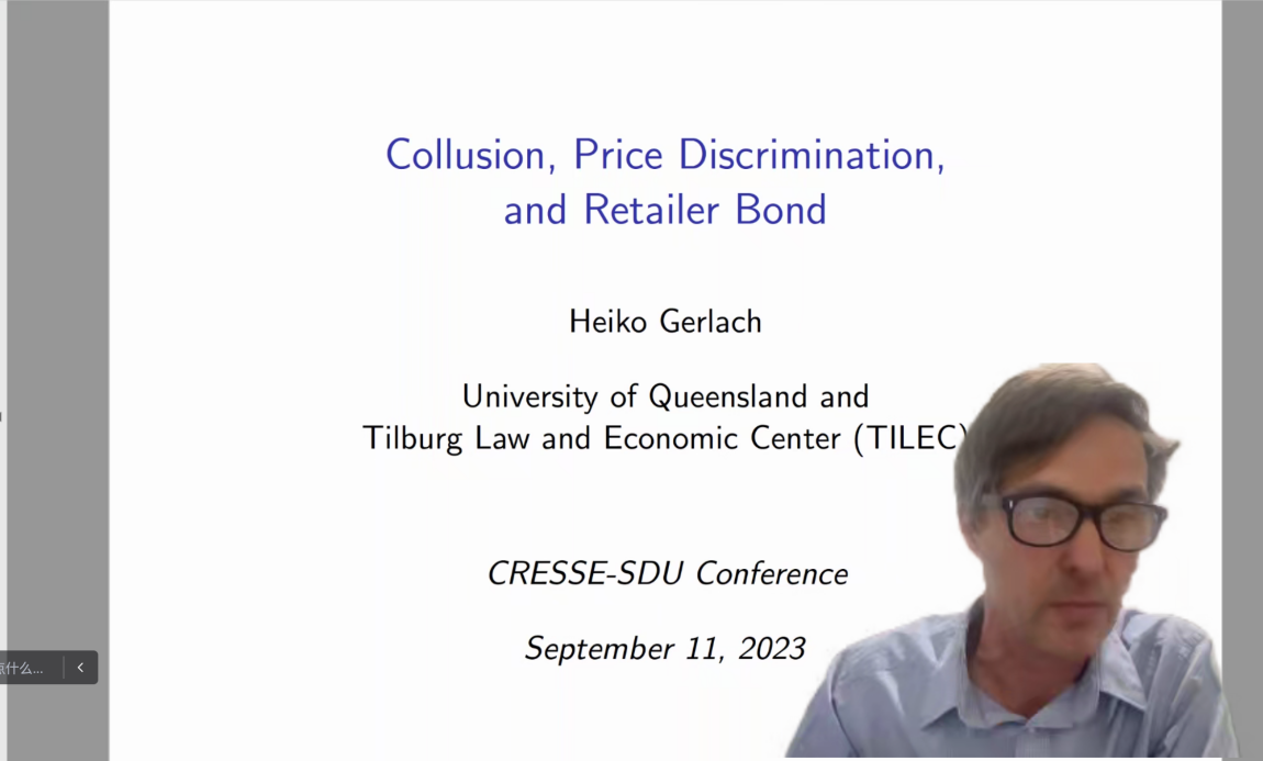 昆士兰大学Heiko Gerlach教授以“Collusion, Price Discrimination and RetailerBond”为题做主题报告。他指出,供应链中的卡特尔是一个重要问题,并指出,下游大零售商的存在往往会增加上游企业卡特尔的稳定性,同时上游厂商会对占主导地位的零售商收取更高的价格,以促进下游的竞争。还通过构建模型研究了价格歧视、纵向整合与卡特尔稳定性的关系。在该模型中,合并是有害的,因为合并后价格会上涨,但在合并发生之前,卡特尔已可能形成。此外,占主导地位的公司和制造商之间的合并也会损害较小的零售商,但与之不同的是,与较小的零售商的垂直合并降低了卡特尔的可持续性,并可以降低价格卡特尔。