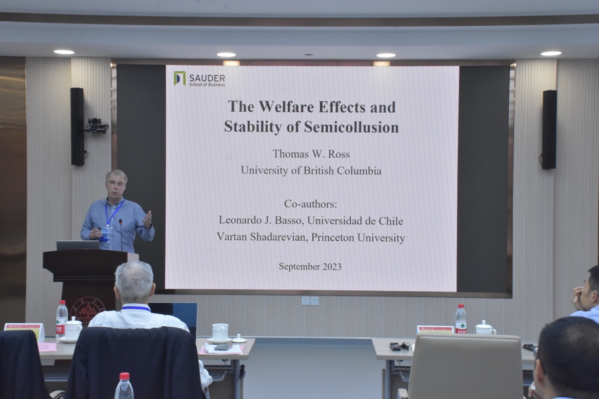 研讨会第三单元由复旦大学管理学院李玲芳教授主持。大不列颠哥伦比亚大学Thomas Ross教授以“The Welfare Effects andStability of Semicollusion”为题,剖析当企业同时进行价格与质量共谋或只考虑其中一个变量共谋时,全共谋与半共谋在利润、价格、质量、福利和消费者剩余以及卡特尔稳定性方面分别具有哪些差异。他指出,研究结论表明,半共谋对消费者的危害虽然不如全共谋,但仍然有害;价格方面的半共谋不如全共谋稳定和有利可图,因而不太可能出现;质量方面的半共谋可能比全共谋更稳定,可能会产生低于竞争水平的价格,使其更难被发现。
