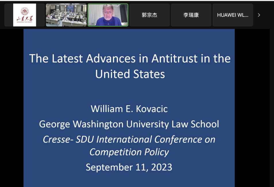 研讨会第一单元由林平教授主持。美国联邦贸易委员会(FTC)前主席、乔治华盛顿大学教授William Kovacic以“The Latest Advances in Antitrust in the United States”为题,系统介绍了美国反垄断改革的最新进展。他从近年美国反垄断体系发生的根本性变化、竞争政策调整所面临的挑战、监管机构的指引三个方面展开了论述,强调竞争政策不仅要关注经济效率,还应实现平等主义目标,以实现消费者福利的最大化。他从诉讼难度、政府部门与受监管企业之间所拥有资源的差距,阐述了反垄断机构的执法困境,指出有必要从法律框架、执法机构运作、执法人员设置等方面进行改良,以更好地推动竞争政策的实施。他同时强调了经济分析的重要性,即在执法过程中不仅应使用简单原则对竞争态势进行推定,还应通过经济学对个案进行分析,特别要关注消费者福利。