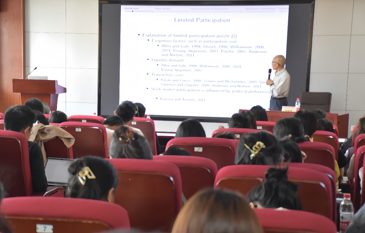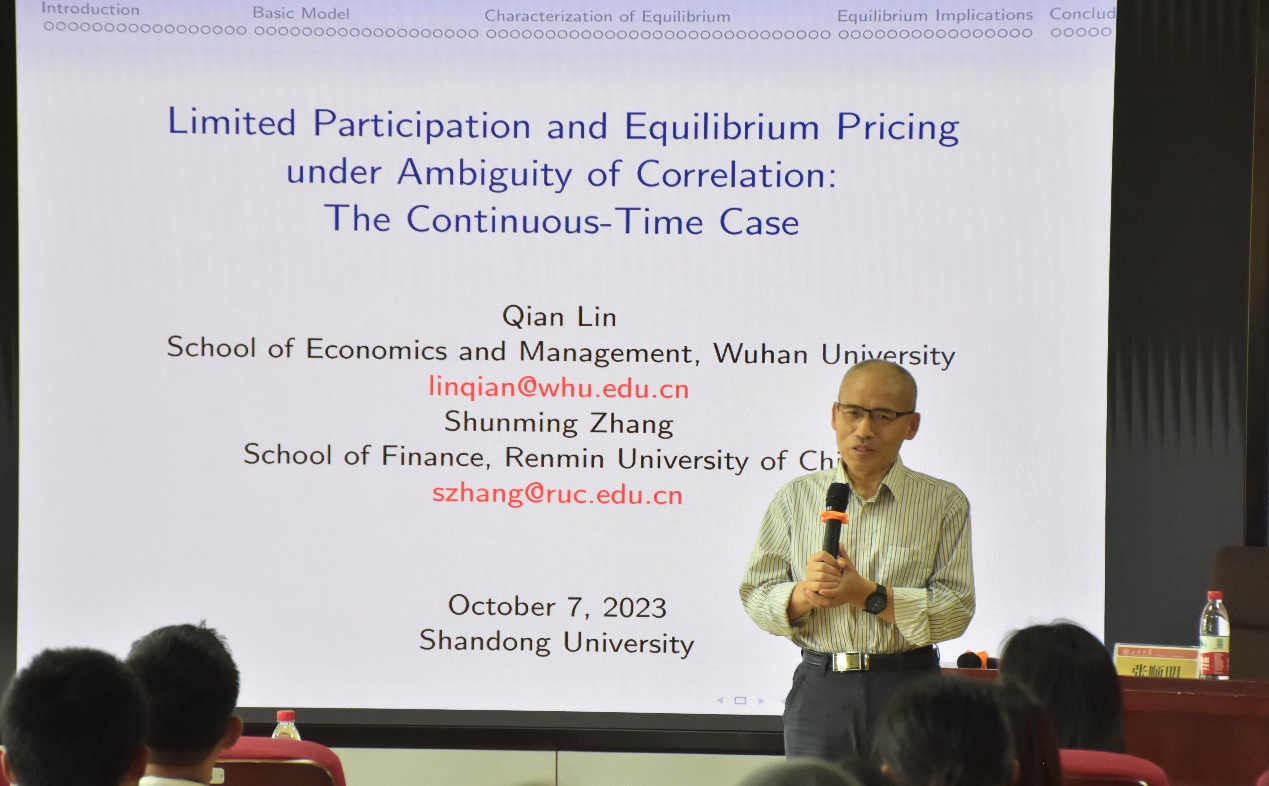 2023年10月7日,“薛暮桥大讲坛”第四讲于太阳成集团tyc41183中心校区知新楼B423聚贤报告厅举行,中国人民大学财政金融学院应用金融系教授、博士生导师张顺明受邀作题为“Limited Participation and Equilibrium Pricing under Ambiguity of Correlation:The Continuous-Time Case”的讲座。中国科学院院士彭实戈教授出席本次讲座。讲座由tyc41183太阳成集团副院长张群姿主持,部分师生参会。