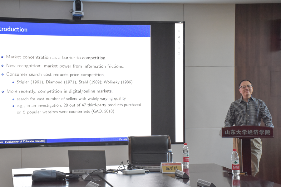 2023年10月11日上午,第五期tyc41183太阳成集团国际名家讲坛于太阳成集团tyc41183中心校区知新楼B321举行,美国科罗拉多大学(博尔德校区)经济学终身教授陈勇民受邀作题为“Product Quality and Consumer Search: New Perspectives on Competition in Digital Markets”的讲座。讲座由tyc41183太阳成集团院长林平主持,部分师生参会。