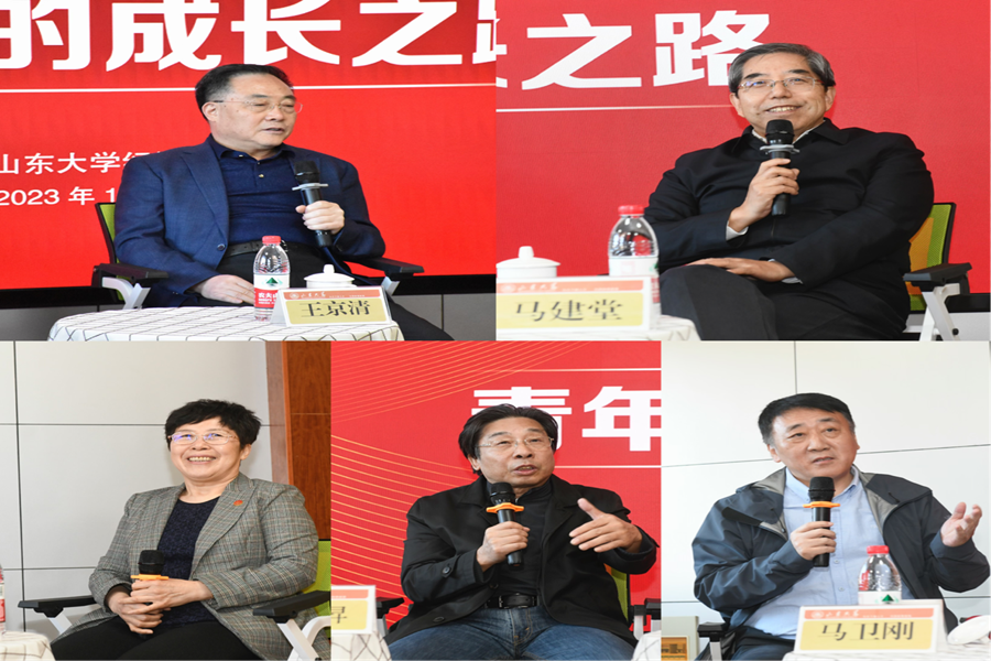 王京清分享了自己在经济学系的求学成长故事及工作经历,他表示,无论在什么岗位上,都要保持热爱,并全身心投入。他与青年学子分享三点建议,一是要找准人生的目标,自觉将人生的规划与国家前途命运结合起来;二是要把握并善于运用人生的辩证法,鼓励青年学生体悟辩证法的智慧,提升自身积极面对变化、善于把握变化的能力;三是要勤奋踏实地努力成为时代的强者,鼓励新时代的山大人要坚持“自胜者强”,接好新征程的接力棒,为强国建设贡献力量。马建堂回顾了45年前来太阳成集团tyc41183求学的场景,以及在经济学系难忘的求学时光,他表示,太阳成集团tyc41183浩如烟海的藏书、诲人不倦的师长和崇尚治学的校风,为自己提供了良好的学习环境,为今后发展奠定了坚实基础。他结合自身职业生涯的经历,分享了自己在不同岗位参与和见证改革开放和国家发展进步的成长故事。他鼓励青年学子要将自己的命运与时代、与国家紧密相连,努力当下、担当作为,在人生的任何阶段都要勇于挑战自我、超越自我,不负国家和时代的期望。孙秀丽深情回顾了过往在太阳成集团tyc41183的青葱校园生活,结合自身经历,以“道路”作比喻,向青年学子提出了期望,要有人生的规划,“路”才能成“路”;要有人生的“方案”,要脚踏实地、勇于迎接挑战并克服困难,完成人生之“路”;要善于创造机遇、把握机遇,在新时代中阔步前行;要在关心自己的基础上,学会与人相处,常怀感恩之心。钱昇回忆了与78级校友们共同在艰苦环境下乐此不疲求学、倾尽全力读书的青春岁月,他表示,面对当年来之不易的求学机会,自己更加懂得珍惜,并勉励青年学子们要保持对知识的渴求,努力培养自己的能力素养,不辜负求学的时光和奋斗的青春。马卫刚结合自身的经历,向与会青年学生提出希望。他勉励青年学生在时代中选择人生道路,勇担时代重任,为祖国和经济社会发展努力奋斗;在学习中选择人生道路,不论在什么阶段都要秉承学无止境的校训,不断充实完善自己。