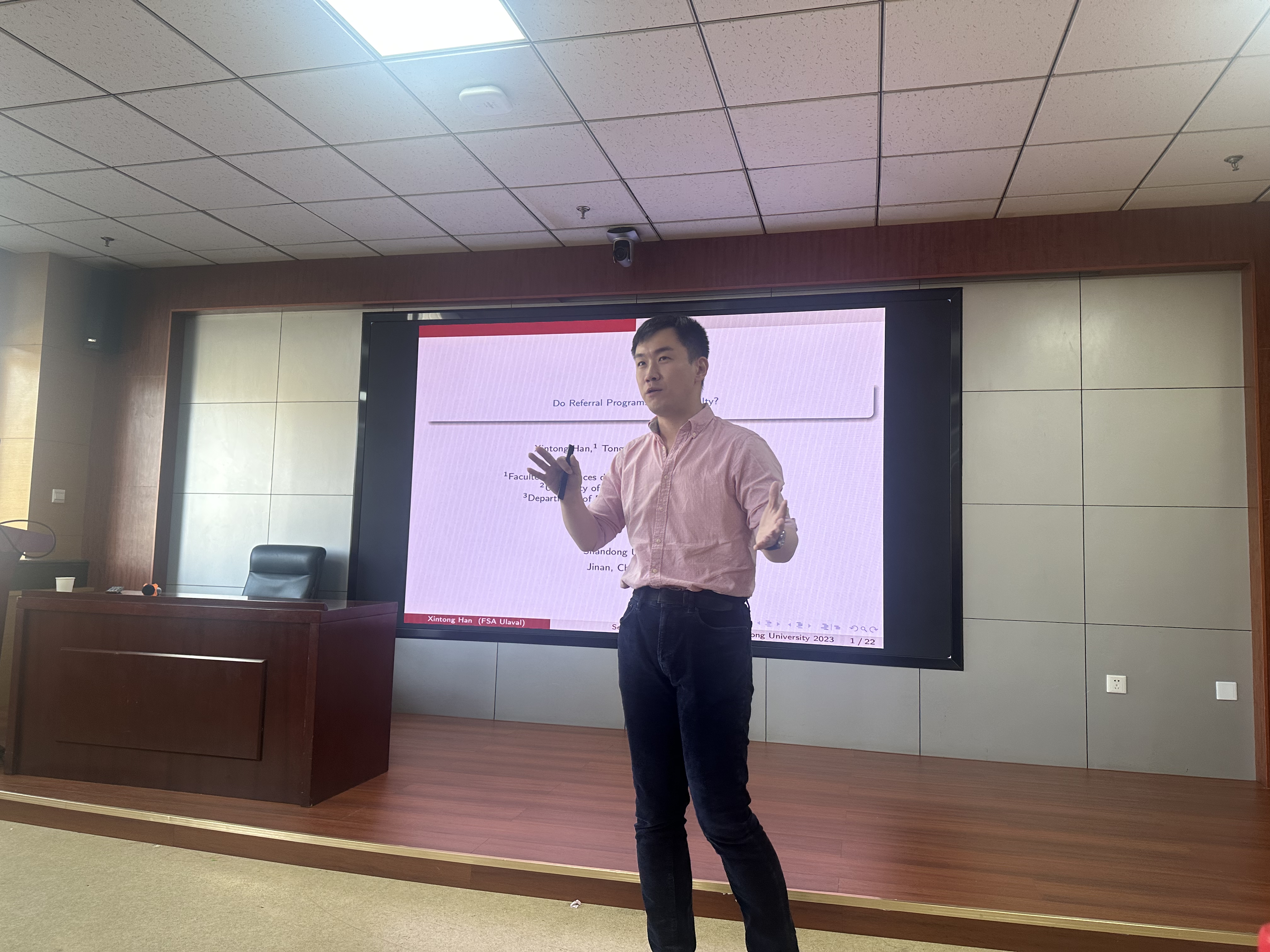 10月26日下午,tyc41183太阳成集团第一期“经济理论与政策前沿”讲座于中心校区知新楼B423聚贤报告厅举行,拉瓦尔大学商学院市场营销系助理教授韩信桐博士做了主题为“推荐计划能带来忠诚么?(Do Referral Programs Drive Loyalty?)”的报告,讲座由tyc41183太阳成集团张吉鹏教授主持,tyc41183太阳成集团经济系部分教师、数字经济特色班部分学生和tyc41183太阳成集团部分研究生参加了讲座。