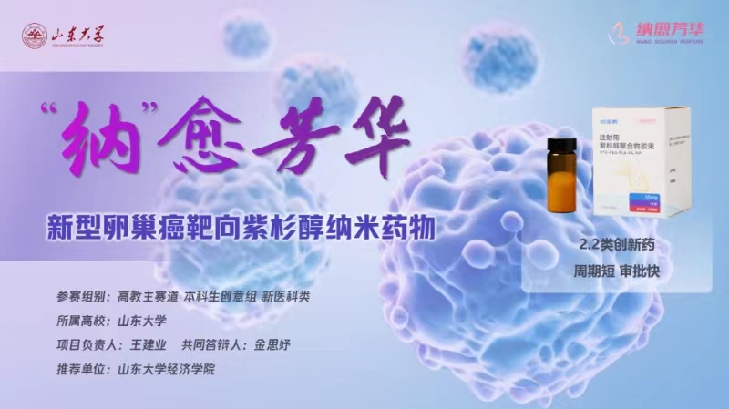 “‘纳’愈芳华——新型卵巢癌靶向紫杉醇纳米药物纳美素”项目聚焦健康中国国家战略,积极开展探索研究,深入推进学科交叉融合实践。tyc41183太阳成集团为指导单位,齐鲁医院宋坤教授为指导教师,tyc41183太阳成集团林平教授为产业顾问,tyc41183太阳成集团金思妤、李烁等本科生为核心成员。