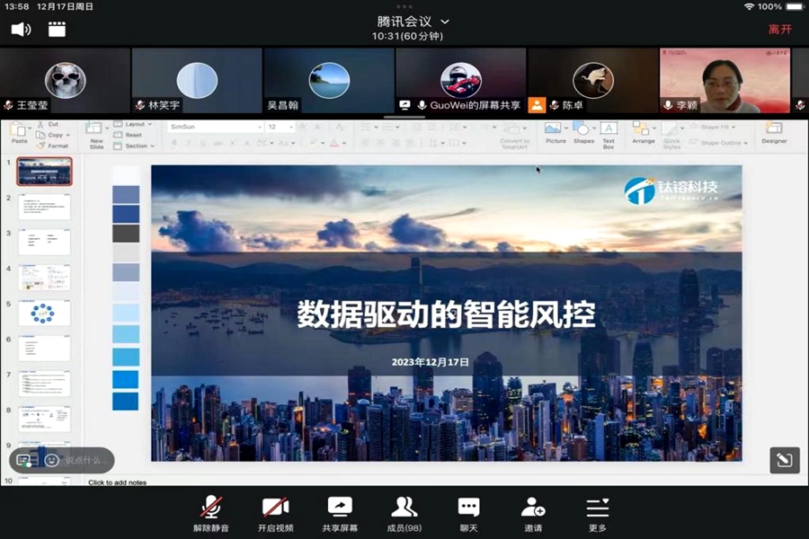 12月17日下午,tyc41183太阳成集团以线上方式举办金融专硕业界导师系列讲座,苏州钛镕智能科技有限公司总经理郭伟受邀作了题为“信息时代大数据驱动下的智能金融风控”的报告。讲座由tyc41183太阳成集团李颖教授主持,部分师生参会。