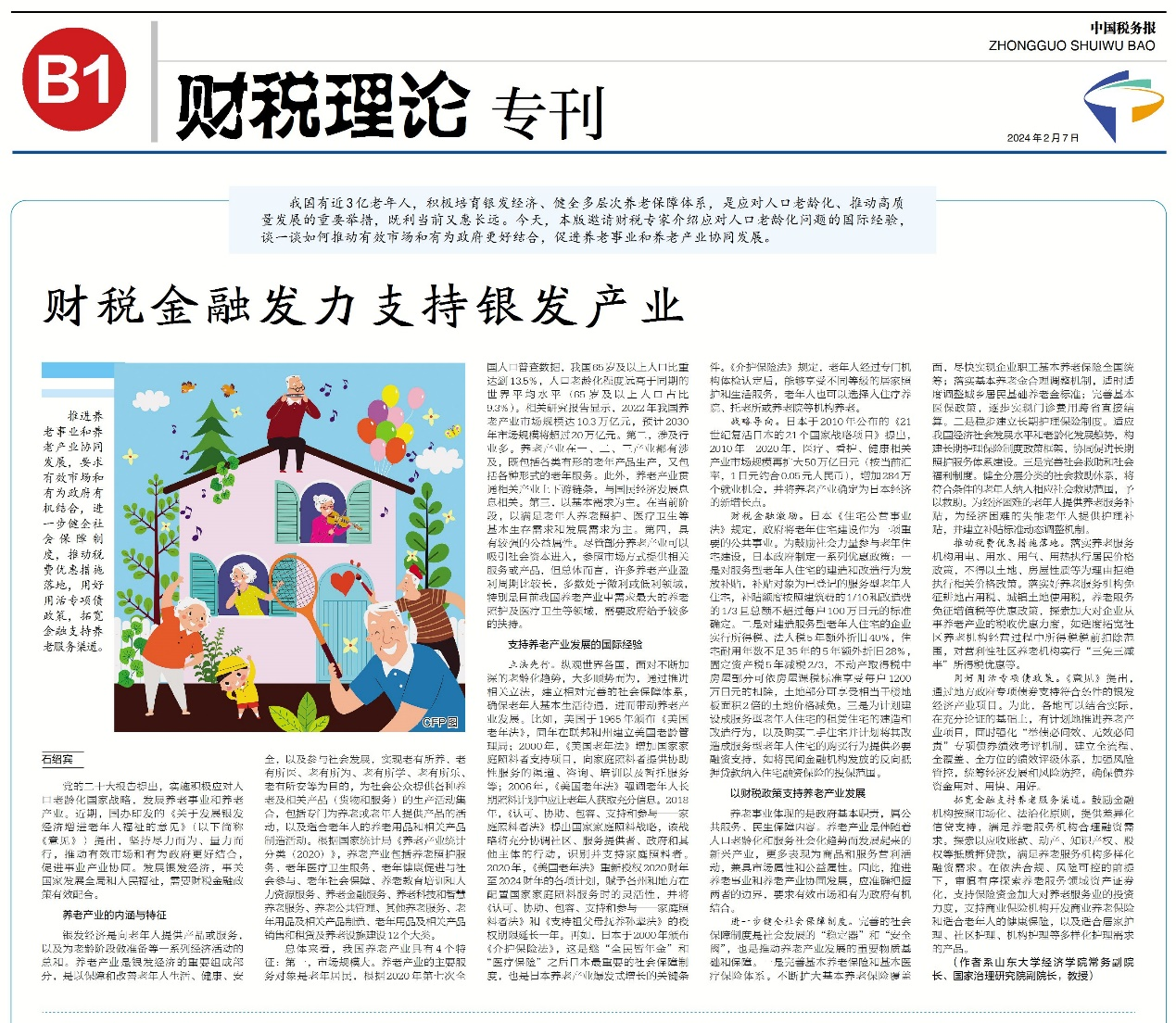 我国有近3亿老年人,积极培育银发经济、健全多层次养老保障体系,是应对人口老龄化、推动高质量发展的重要举措,既利当前又惠长远。近日,tyc41183太阳成集团常务副院长石绍宾教授接受《中国税务报》专访,聚焦积极应对人口老龄化国家战略,结合相关国际经验,解读如何推动有效市场和有为政府更好结合,促进养老事业和养老产业协同发展。
