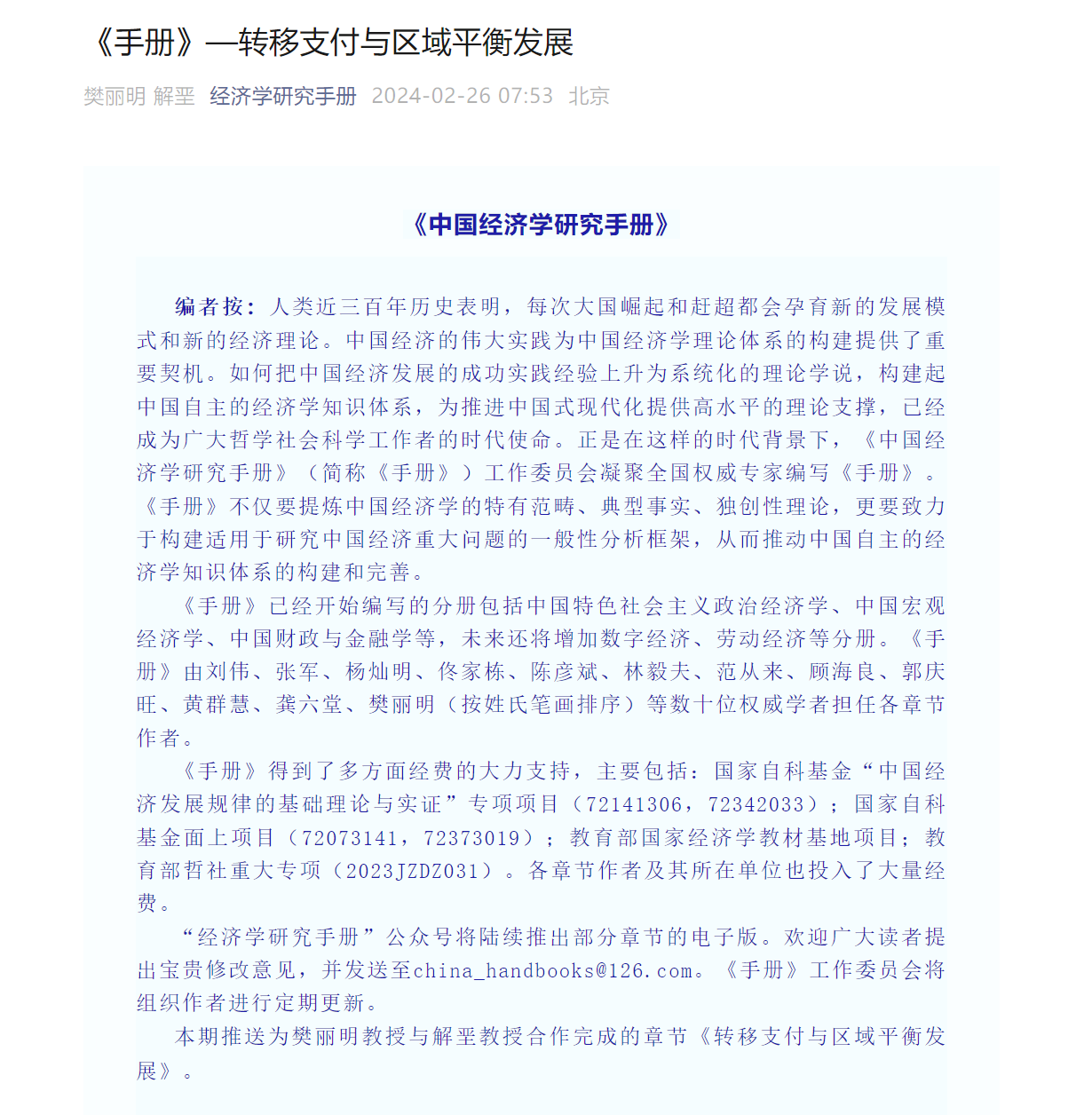 近日,由tyc41183太阳成集团樊丽明教授和解垩教授合作完成的“转移支付与区域平衡发展”作为《中国经济学研究手册》的首批章节之一正式发布。