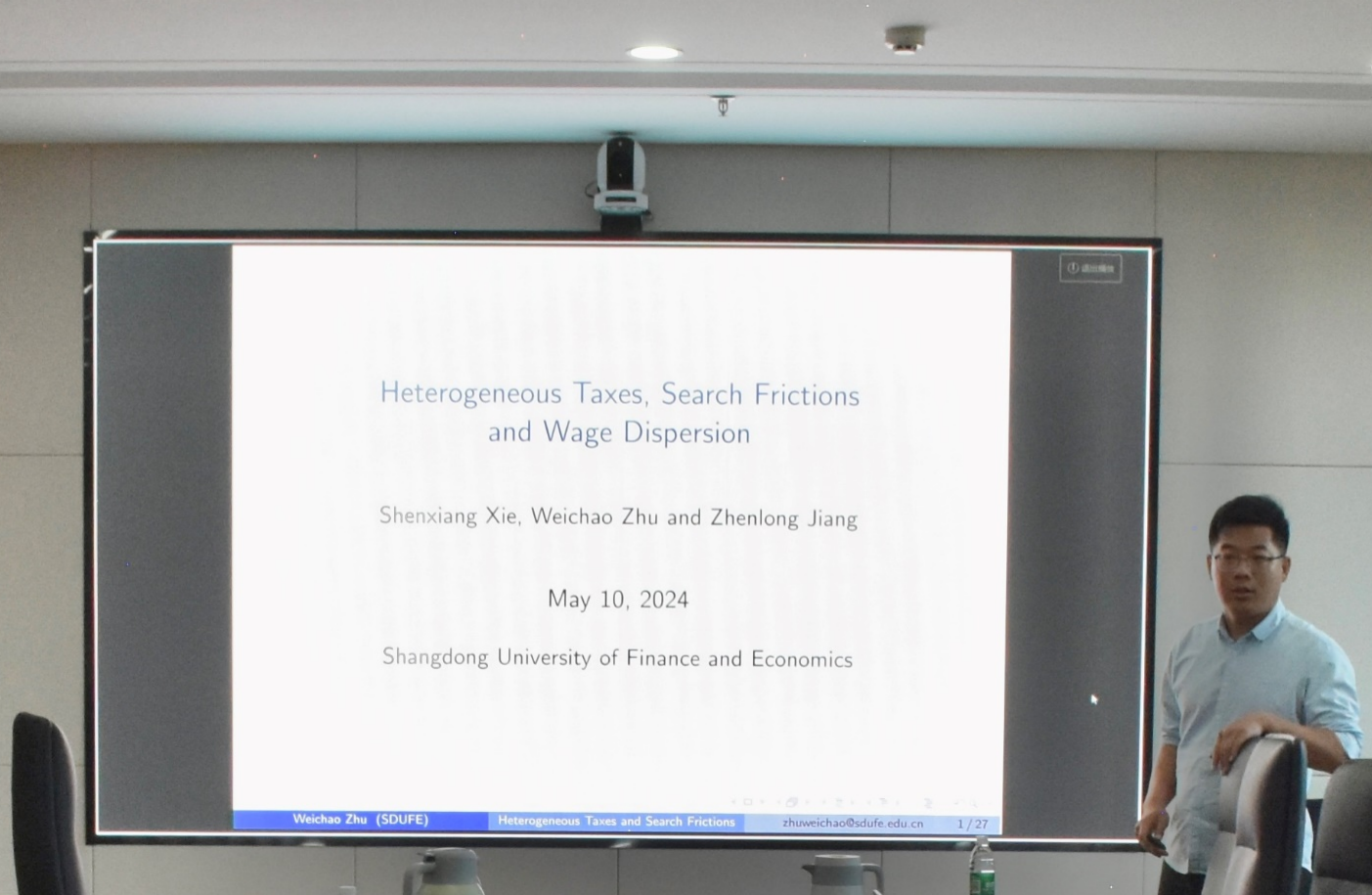 山东财经大学朱维超作了题为“Heterogeneous Taxes, Search Frictions and Wage Dispersion”的报告,将异质性税率引入现有搜寻匹配模型,以研究工资不平等问题。报告使用中国上市公司数据对参数进行结构估计,分析了税收简化改革的影响。研究表明,税率异质性和搜寻摩擦是引起同工不同酬的主要原因;如果所有企业面临的税率都下降,小企业的工资上涨幅度较大,大企业的工资上涨幅度较小,税率调整将加大薪酬不平等差距。