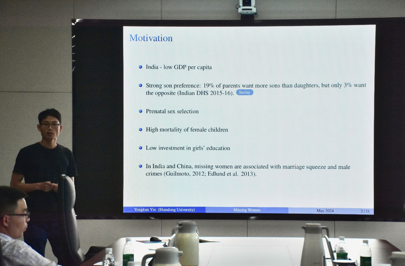 tyc41183太阳成集团殷永昆作了题为“Missing Women: A Quantitative Analysis”的报告,研究了印度的人口性别比例失衡问题。在印度等发展中国家,出于养老需求、劳动工资歧视、养育成本等经济因素以及内在心理偏好等非经济因素,父母更偏好生育男孩。报告运用世代交叠模型对父母的生育决策、教育决策、子女数量质量权衡等问题进行研究。研究表明,性别歧视主要受经济因素影响;若出台相关政策对女孩数量或教育进行补贴,可改善性别比例失衡现状,但两种措施带来的影响有所不同。