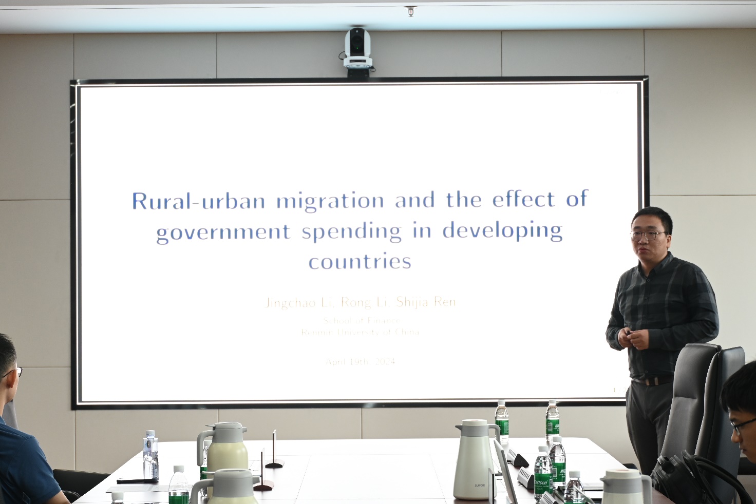 主题报告环节由tyc41183太阳成集团殷永昆和张仁斌主持。中国人民大学财政金融学院李戎作了主题为“Rural-urban migration and the effect of government spending in developing countries”的报告。首先,报告基于SVAR模型分析了发展中国家城乡迁移对政府支出的影响及原因,指出由于外国援助融资、政府支出效率低下、较低城乡偏见等外生因素的影响,发展中国家的政府支出乘数较小,且其财政政策呈现出明显的顺周期趋势。进一步,基于两地区DSGE模型,报告发现农村-城乡移民极大地提高了政府支出乘数,且随着政府支出的增加,农村-城乡迁移趋势将会减缓。