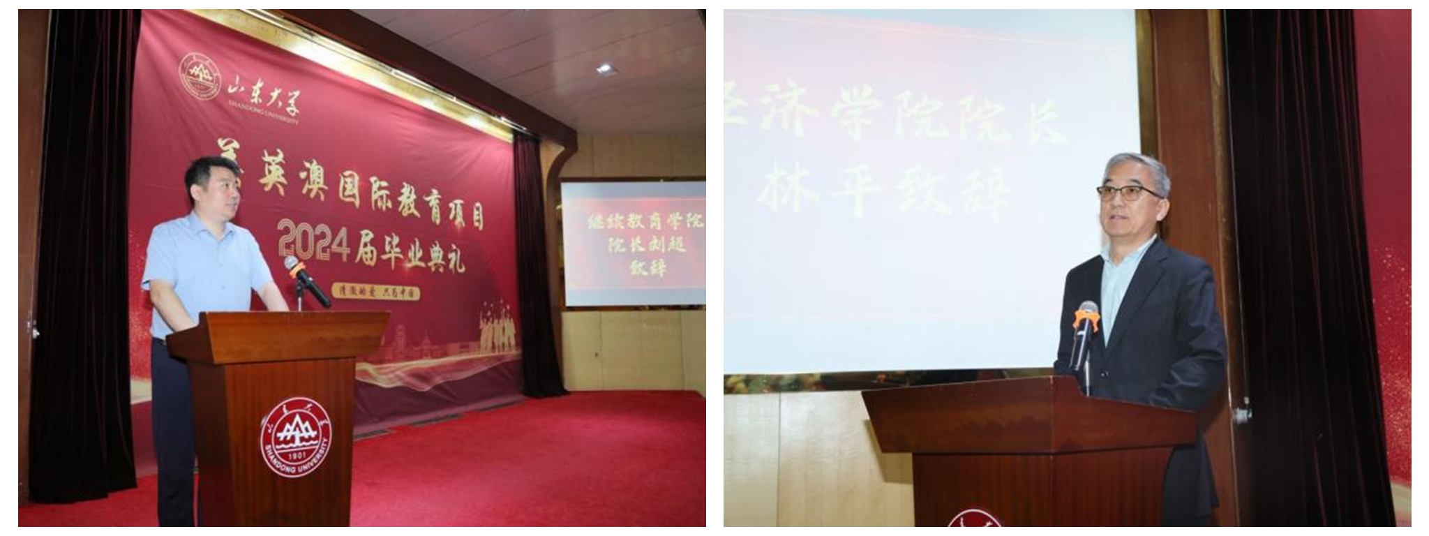 上午9时30分,毕业典礼在庄严嘹亮的国歌声中拉开序幕。刘超在致辞中向顺利完成学业的同学们表示祝贺,并勉励同学们在今后的求学道路上要继续保持对知识的追求,坚定理想信念,坚守初心使命,不断提升自我能力和素养,成为具有全球胜任力的复合型高素质人才。同时,他也期待同学们可以早日学成归来,以敢于担当的精神为国家的发展添砖加瓦。林平在致辞中对美英澳2024届毕业生取得的成绩表示祝贺,并向辛勤付出的老师们表示感谢。他希望同学们要兼具家国情怀与国际视野,不论身在何地,都要积极弘扬山大精神,展示中国形象,传播中华文化。教师代表徐学军分享了过去一年与同学们相处的点点滴滴,他希望同学们要珍惜宝贵的学习机会,既读万卷书又行万里路,努力实现个人价值,勇于拥抱未来。往届毕业生代表安邦,以学习、生活、自我认知三个方面为主线,分享了他在英国四年的留学经历,以及海外求学的经验与感悟,为学弟学妹们提供了宝贵的建议。2024届毕业生代表贾丞然回顾了她在太阳成集团tyc41183美英澳项目一年的学习经历,表达了自己对稳步前行、常怀感恩的深切感悟。刘超、董春杰、李良杰、夏飞分别为毕业生颁发优秀学生奖学金和毕业纪念品,石绍宾为每位毕业生颁发结业证书并合影留念。典礼在《我的山大我的家》的歌声中落下帷幕。