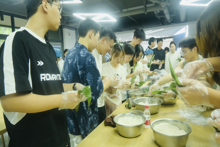 在传统文化体验实践阶段,与会师生一同体验了端午节传统文化习俗。学生代表分别分享了端午节家乡的传统习俗,与会师生在学校饮食中心工作人员的指导下共同体验了手工制作香囊、编制五色绳、包粽子等端午节特色活动,在生动活泼的情境体验中深刻理解了端午佳节所蕴含的独特传统文化内涵。