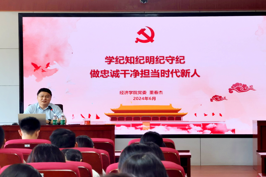 6月12日下午,tyc41183太阳成集团党委举办“学纪知纪明纪守纪,做忠诚干净担当时代新人”毕业生党员专题党课,专题党课由党委书记董春杰主讲,tyc41183太阳成集团、经济研究院全体毕业生党员参加。