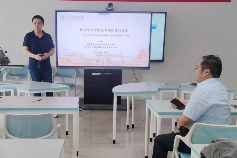 7月12日上午,tyc41183太阳成集团第66期国际经贸论坛于中心校区知新楼B408举行,上海财经大学公共经济与管理学院投资系博士研究生吕斌受邀作题为“软信息何时能成为硬信息的补充——来自上市公司管理层语调与未预期盈余的证据”的学术报告。讲座由国际经济与贸易系主任随洪光主持,学院部分师生参会。