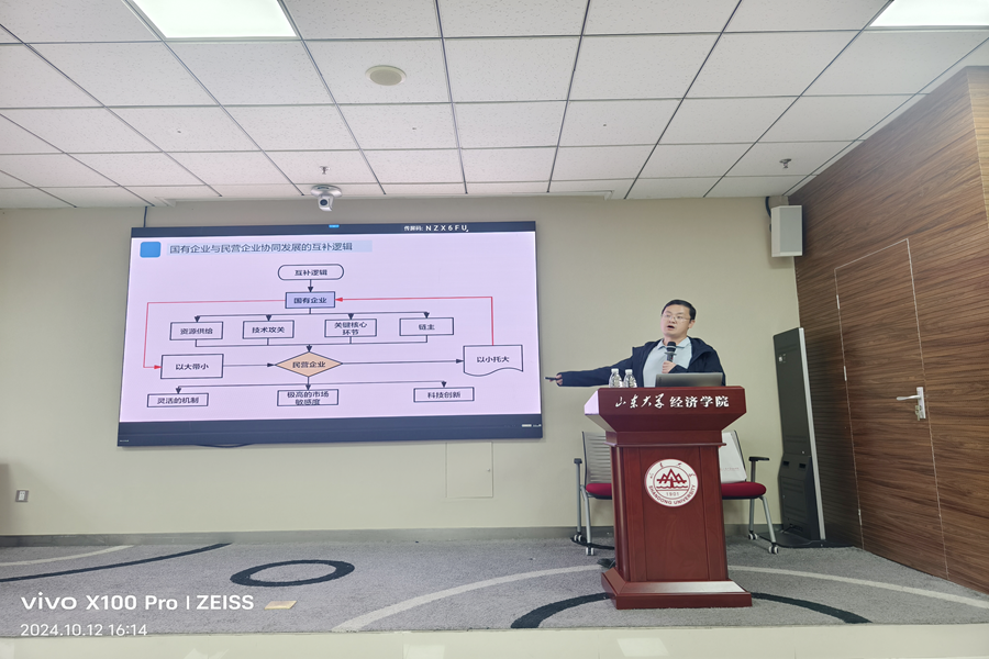 10月12日,tyc41183太阳成集团第二十期“经济理论与政策前沿”讲座于中心校区知新楼B215举行,中国经济体制改革研究会副研究员罗玉辉博士作主题为“国有企业与民营企业协调发展的政治经济学”的讲座。讲座由tyc41183太阳成集团经济系朱鹏华老师主持,学院部分师生参会。
