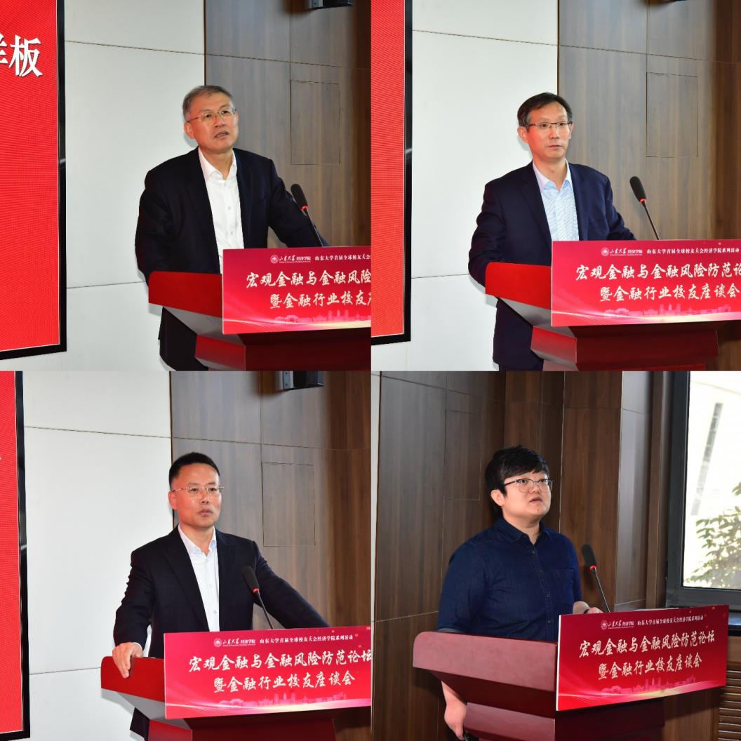 交流研讨环节,88级校友、北京银行济南分行党委书记、行长田宏以小微企业融资难、融资贵以及金融服务创新为切入,阐述了当前阶段小微企业金融服务的挑战与机遇,就如何通过金融服务创新破解小微企业融资困境、推动金融科技创新发展进行了探讨。93级校友、国家金融监管总局潍坊监管分局党委书记、局长孙宝刚就金融强国建设与金融监管创新进行了解读,分析了当前金融监管面临的挑战,并对金融监管总局在建立兜底监管机制、强化央地监管协同、全面落实五大监管理念以及防范化解金融风险等方面的举措进行了剖析。91级校友、山东省私募股权投资基金业协会会长李文峰基于创投行业发展的现状与挑战,对创投行业的政策环境、投资规模及对地方经济的推动作用进行了全面剖析,并围绕如何优化创投人才评价机制、推动容错免责机制落地及加强政府支持力度等关键议题,对创投行业未来的政策协调路径提出了具体建议。91级校友、中国农业银行山东省分行党校常务副校长、研修中心主任王岩林从金融教育培训的重要性、内容的核心要素、文化引领等方面,对金融行业教育培训的现状及作用进行了简要介绍,就如何通过强化文化引领、优化教育培训内容、提升金融从业人员综合素质提出了若干策略与建议。