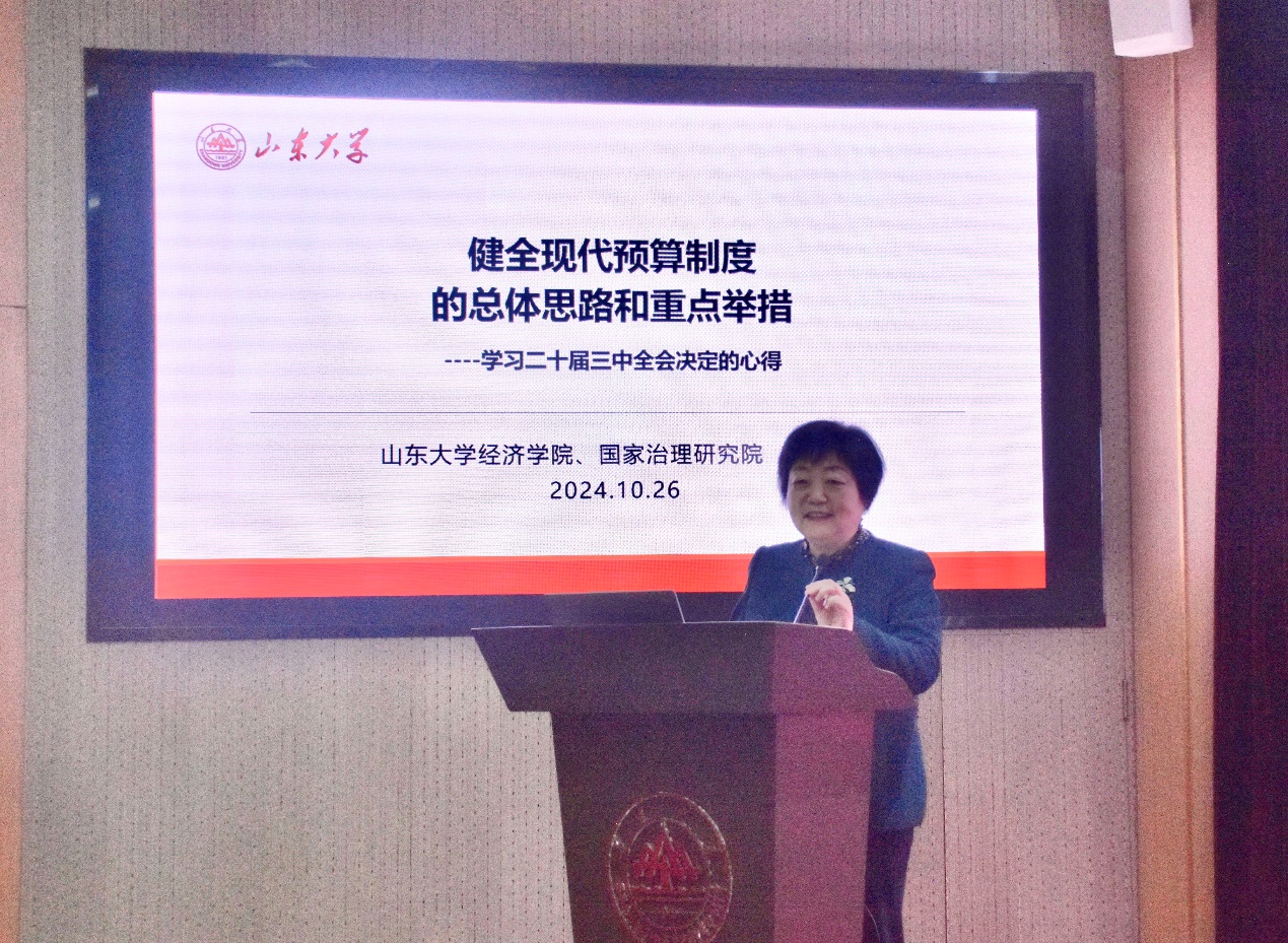 樊丽明做了题为“健全现代预算制度的总体思路和重点举措——学习党的二十届三中全会决定的心得”的主旨报告。樊丽明强调,要把握党的二十届三中全会决定中深化财税体制改革的要义,应该注意结合中国财税体制改革历史、国家治理现代化的需求、全面推进强国建设和民族复兴伟业的全局性目标去认识。在回顾中国自1999年以来预算制度改革历程的基础上,樊丽明指出,与国家治理现代化相适应的现代预算管理制度框架已基本建立,预算治理体系的“四梁八柱”已基本成型,未来预算制度改革需要把握强国建设、民族复兴伟业的目标导向和健全现代预算制度的问题导向,在深化细化已有重点改革举措的基础上,以增强财政治理能力为重点继续深化改革。最后,她从增强财政统筹保障能力、宏观调控能力、规范管理能力、绩效管理能力和预算协同监督能力五方面提出了健全现代预算制度的重点举措。