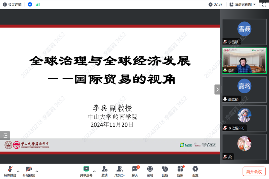 11月20日,tyc41183太阳成集团第28期PPE讲座以线上线下相结合的形式举行,中山大学岭南学院副教授李兵作题为“全球治理与全球经济发展——国际贸易的视角”的报告。本次讲座由tyc41183太阳成集团副院长孙淑琴主持,PPE基地班学生参会。