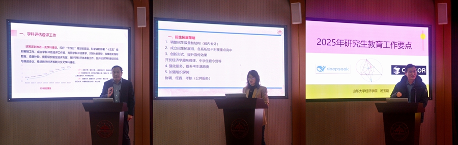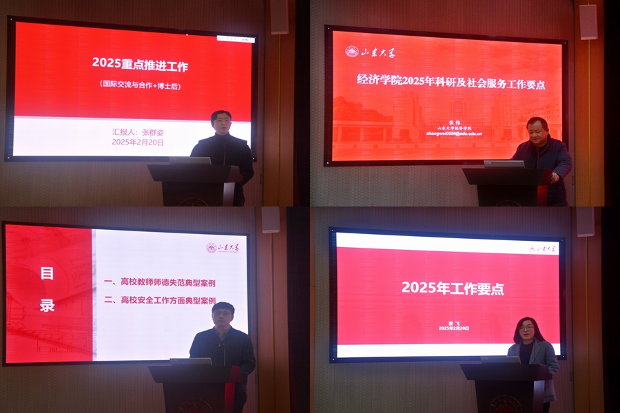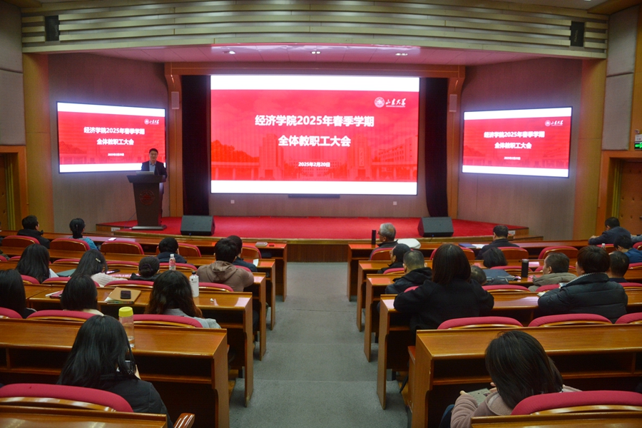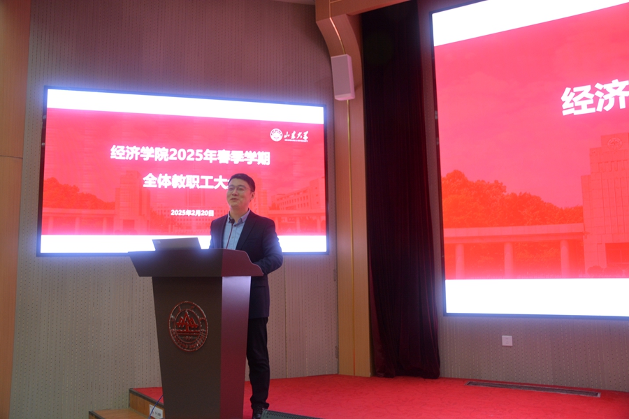 董春杰传达了校领导班子寒假工作务虚会(读书班)及新学期工作会议精神,并就做好2025年学院工作提出要求。期望全体教职工全面深入落实国家及学校党委战略部署,坚定把握新时代背景下的新使命与新任务,为教育强国和中国式现代化建设贡献力量;全体经院人应充分展现敢闯敢创的精神风貌,积极进取,不懈追求事业发展的新高度,努力打造一流学科;诚挚期望各位教职工积极参与学院治理,汇聚各方资源力量,携手共建一流学院;坚守安全发展底线,为学院各项事业的持续健康发展提供坚实有力的支撑与保障。