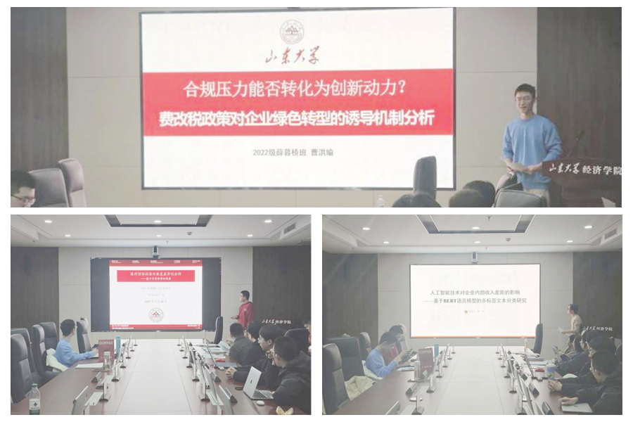 研文会上,来自薛暮桥班的三位同学分别进行论文汇报。曹洪瑜以《合规压力能否转化为创新动力?费改税政策对企业绿色转型的诱导机制分析》为题,深入探讨了新环保税法政策对企业绿色创新的促进机制和实践路径。徐广田围绕《医疗信任品卖方垂直差异化分析——基于专家投资的视角》进行汇报,基于医疗体制改革背景,文章构建动态博弈模型探讨专家水平和治疗行为之间的关系,进而阐述专家何时具有投资动机,并提出相关政策建议。鲍一平汇报了题为《人工智能技术对企业内部收入差距的影响——基于BERT语言模型的多标签文本分类研究》的论文,在人工智能技术迅速发展背景下,文章聚焦企业内部分配公平性议题,创新性采用BERT语言模型测度企业层面人工智能技术发展水平,进而实证检验其对企业内部收入差距的作用机制。王曈、李俊乾、程龙分别从研究设计优化、论文结构调整、汇报展示技巧等方面提出意见建议,给予专业指导。
