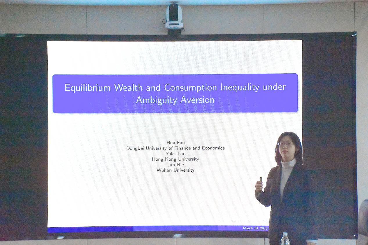 报告在模糊厌恶框架下构建了连续时间一般均衡Bewley-Huggett-Merton型模型,假设债券市场和股票市场出清,人们同时表现出风险厌恶和模糊厌恶,通过随机动态优化求解一般均衡。研究指出,在一般均衡框架下,模糊厌恶会对投资产生冲击,从而减少财富和消费不平等。通过对比风险厌恶、模糊厌恶和折旧因子在不平等水平的应用,研究发现模糊厌恶的增强所产生的影响与风险厌恶的增强所产生的影响大不相同。风险的提高和模糊厌恶的增强一样会降低不平等水平,然而由于消费抑制和价格效应,人们对风险厌恶的提高会加剧不平等。与此同时,模糊厌恶可能会因价格变化而带来福利收益,而在局部均衡下,人们对模糊性厌恶的提高会带来福利损失。讲座过程中,樊华与参会师生就模型构建、传导机制等方面展开深入讨论。