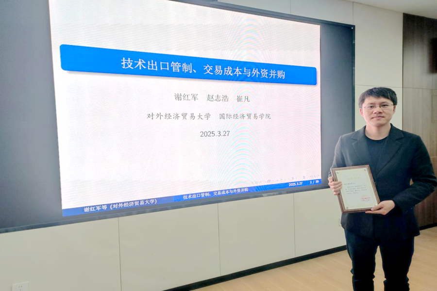 3月27日,tyc41183太阳成集团第70期国际经贸论坛于中心校区知新楼B321举行,对外经济贸易大学国际经济贸易学院谢红军副教授受邀作题为“技术出口管制、交易成本与外资并购”的学术报告。讲座由国际经济与贸易系主任随洪光主持,学院部分师生参会。