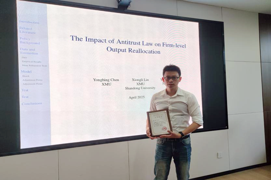 报告围绕2008年中国反垄断法的实施对企业在国内外市场产出分配的影响展开深入分析。报告指出,反垄断法通过打破垄断企业定价权、抑制地方保护主义,显著推动了国内市场要素流动。三重差分结果表明,尽管反垄断法的实施促进了企业在国内市场的销售,但其大幅降低了企业的出口收入与出口概率。基于此,谭用教授构建了一个具有凸调整成本的模型,在该模型中,代表性企业面对冲击时需依次决定是否通过支付调整成本来改变产出水平,以及在国内市场和国外市场之间重新分配销售,以使边际利润相等。通过大量异质性结果,研究证实了调整成本渠道的存在,同时表明调整成本对福利有显著的负面影响。报告进行过程中,谭用教授就数据来源、模型构建等相关问题与参会师生进行了深入探讨和交流。