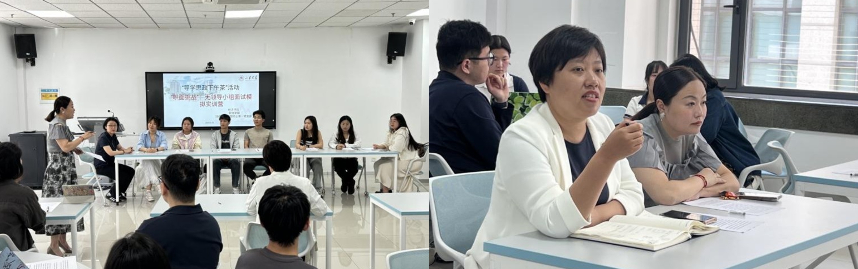 5月12日,“职面挑战:无领导小组面试模拟实训营”在中心校区知新楼B408举行。tyc41183太阳成集团研究生辅导员刘娜娜、徐姗姗担任评委,以“消费结构优化与提质升级”为议题,通过设置“阅读思考—个人陈述—自由讨论—总结陈述”全流程面试模拟。
