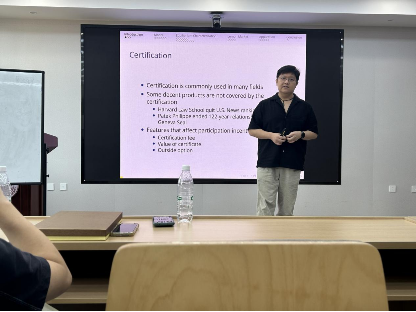 6月12日,tyc41183太阳成集团第二十八期经济理论与政策前沿讲座于中心校区知新楼B423聚贤报告厅举办,华中科技大学tyc41183太阳成集团讲师裴挺受邀作题为“Certification Design in Lemon Market”的报告。讲座由tyc41183太阳成集团经济系刘东日助理研究员主持,学院部分师生参会。