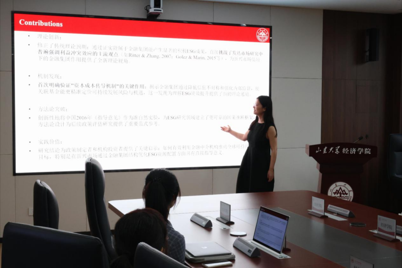 报告介绍了纲领性绿色信贷政策以及银行系基金的定义,对当前银行系基金、ESG方向的研究进行梳理,进而提出“银行系基金公司是否会提升或者损害其ESG投资水平”问题。对此,报告以2016年中国人民银行联合多部委发布的《关于构建绿色金融体系的指导意见》作为准自然实验,探讨了银行系与非银行系基金在绿色投资行为上的差异。结果表明,政策实施后,相较于非银行系基金,银行系基金对ESG资质优良企业的资金配置会显著增加。这种资本重配带来了企业层面ESG表现的实质性提升,表现为环境绩效改善和绿色创新活动增加,并且融资摩擦降低是产生这些积极ESG成果的核心机制,从而为“资本成本传导渠道”提供了强有力证据。交流互动环节,王霄霄与参会师生针对短期收益率高的基金是否会随着时间推移而下降回归到均值等问题展开深入讨论。