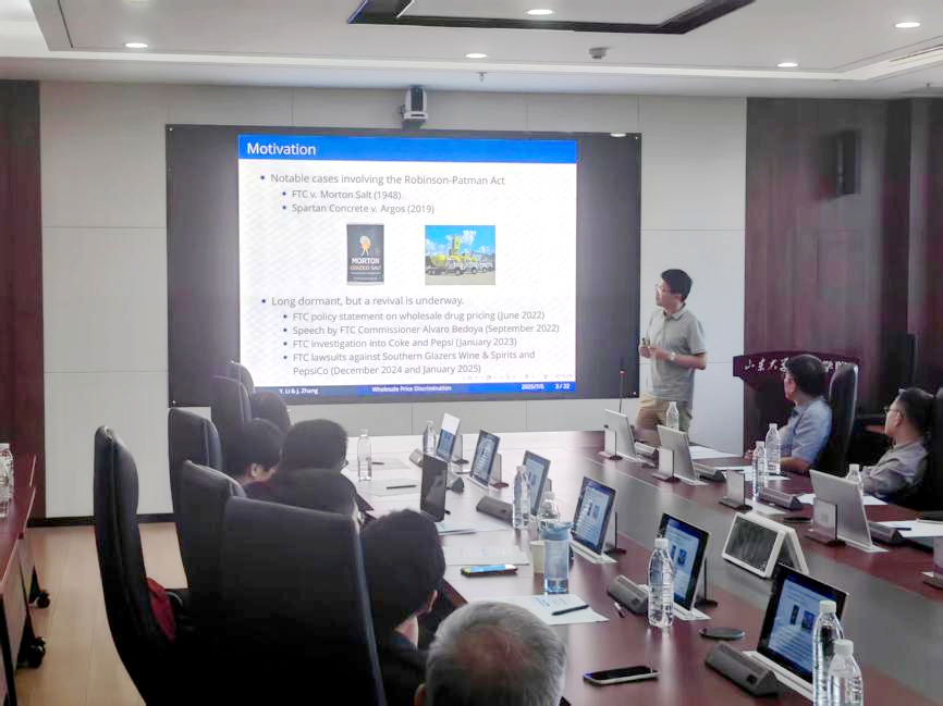 华东理工大学经济学系主任、数字经济研究所所长李佑平作题为“Cost Justification for Wholesale Price Discrimination”的报告,报告分析了上游垄断者对下游企业基于边际生产成本的价格歧视,指出社会总福利在附加定价(additive pricing)和在差别定价(differential pricing)下总是高于统一定价(uniform pricing)。这种差异源于基于成本差异的价格歧视能够优化生产资源配置,从而提高经济效率。