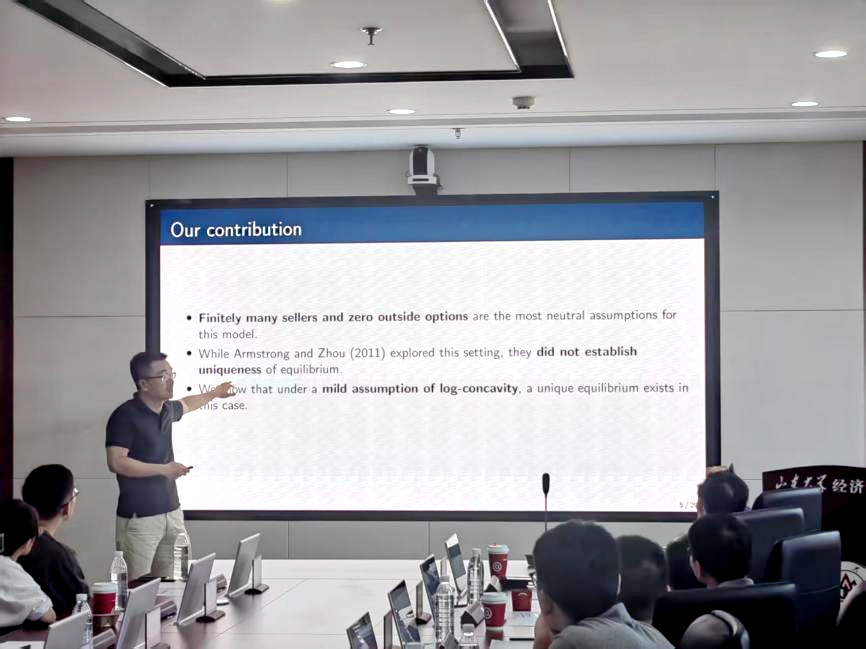tyc41183太阳成集团助理研究员杨逸希作题为“Wolinsky(1986)Redux Consumer Search with Outside Options”的报告。研究基于Wolinsky(1986)分析存在外部选项时消费者在多家企业市场搜索产品行为,每家企业生产一种事前同质的产品,发现在较宽松条件下存在唯一对称价格均衡。报告同时对均衡结果进行比较静态分析。