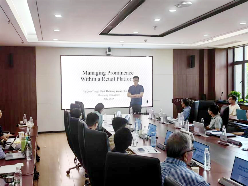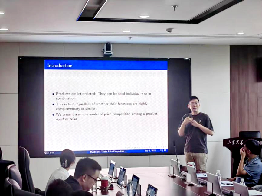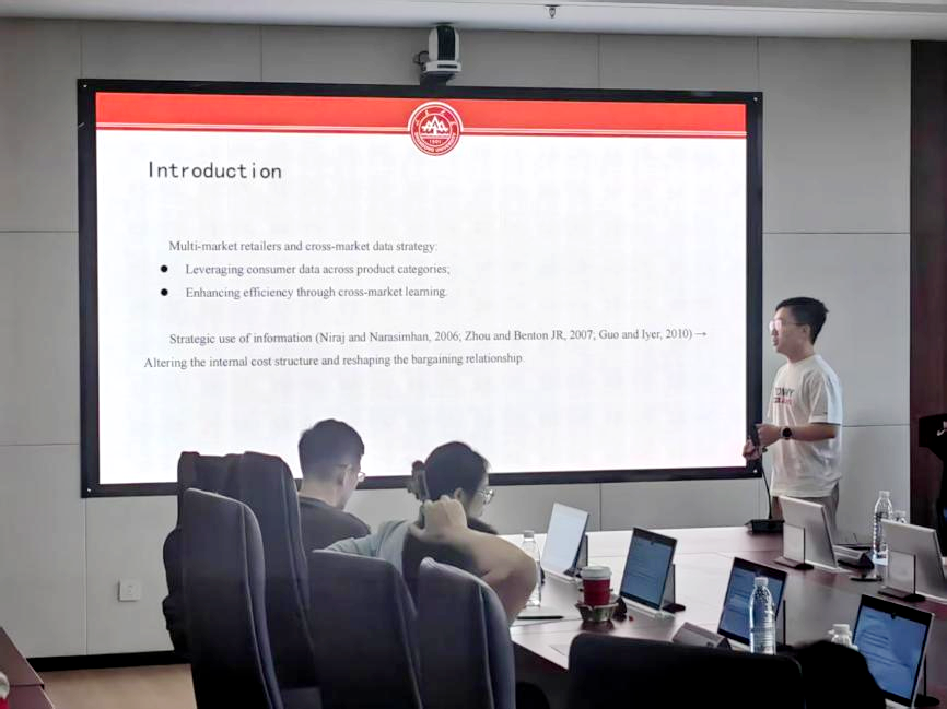 tyc41183太阳成集团博士生刘稞萌作题为“Vertical Data Sharing and Supplier Encroachment”的报告,分析下游零售商数据分享对上游供应商直销策略、自身分享数据激励及数据流动对社会福利的影响。研究发现,若零售商成本优势足够大,会主动分享数据,且分享能带来帕累托改进,使供应商、零售商和消费者都受益。