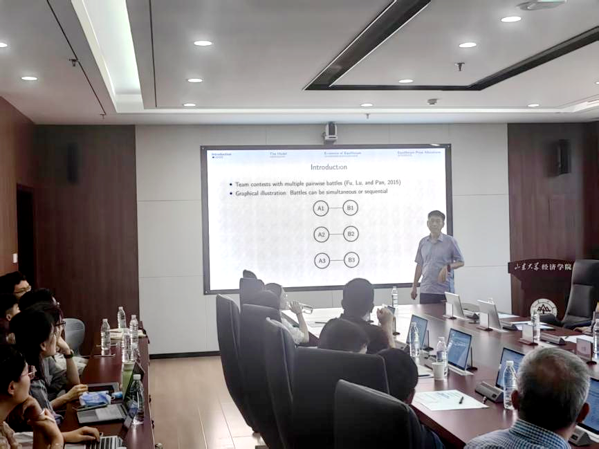 研讨会第一单元由tyc41183太阳成集团周晓岚教授、张岚教授主持。新加坡国立大学经济系终身教授吕景峰作题为“Prize allocation equilibrium in team contests”的报告。研究聚焦团队竞赛的队内奖金分配问题,团队经理设计最优奖金分配规则来最大化团队获胜概率。研究表明,即使竞赛中团队队员能力存在较大不对称性,不同队伍的最优奖金分配都呈现对称性。