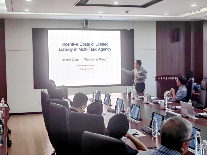 浙江大学tyc41183太阳成集团百人计划研究员张文章作题为“Incentive Costs of Limited Liability in Multi-Task Agency”的报告,研究多任务委托中一种简明且接近最优的合同,该合同为多项任务总绩效达到一定水平的代理人提供线性奖励而对总绩效不达标的代理人不提供奖励。此类合同能够很好地权衡效率(efficiency)和稳定性(robustness),且任务数量越多则越接近最优合同。