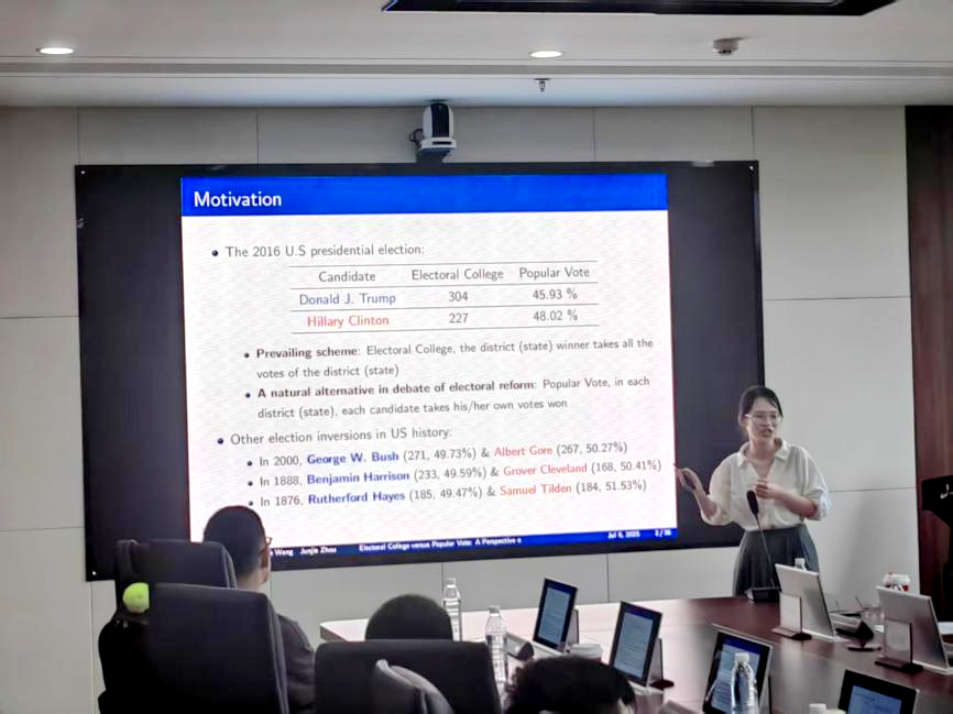 中国人民大学tyc41183太阳成集团经济系讲师汪紫珈作题为“Electoral College versus Popular Vote”的报告。研究聚焦于选举团(electoral college,EC)和普选(popular vote,PV)两种总统选举机制,EC可获获胜州所有选票,PV只能获投给自己的选票。EC相较于PV给予强势候选人更大的获胜概率;当两个候选人实力相近时,EC下的总选举费用要更高;EC相对于PV产生反转(inversion)的可能更小。