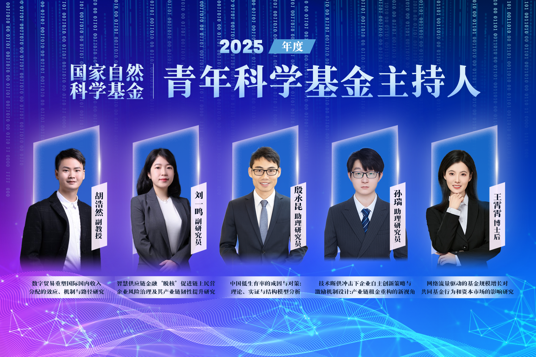 胡浩然副教授主持的“数字贸易重塑国际国内收入分配的效应、机制与路径研究”,刘一鸣副研究员主持的“智慧供应链金融‘脱核’促进链上民营企业风险治理及其产业链韧性提升研究”,殷永昆助理研究员主持的“中国低生育率的成因与对策:理论、实证与结构模型分析”,孙瑞助理研究员主持的“技术断供冲击下企业自主创新策略与激励机制设计:产业链租金重构的新视角”,王霄霄博士后主持的“网络流量驱动的基金规模增长对共同基金行为和资本市场的影响研究”获青年科学基金项目资助。