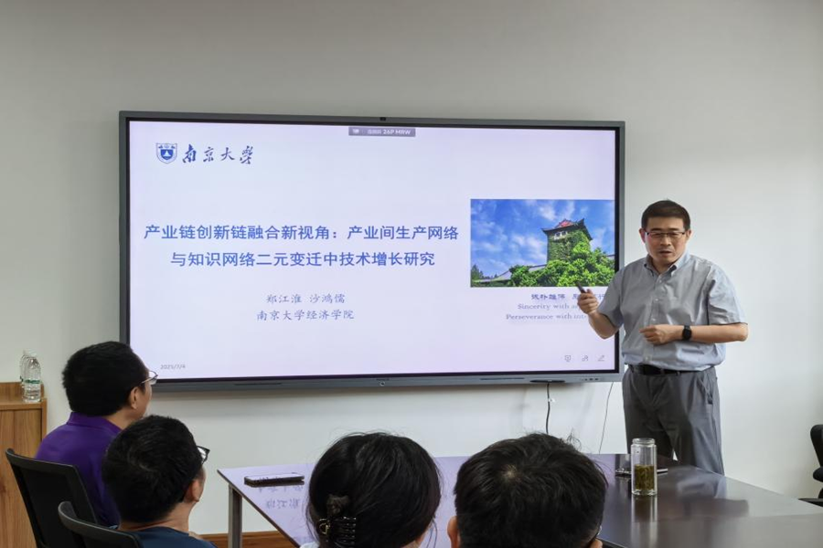 报告以2002—2015年区域间投入产出表构建生产网络,用中国知识产权发明型专利引用关系构建创新网络,探究生产网络与创新网络融合中的创新结构变迁及产业技术增长。研究发现,随着经济发展水平不断提高,行业间的生产联系和创新联系持续增强,科学基础型行业在生产网络和创新网络中占据高位,吸引创新资源集聚并推动产业结构变迁,同时,生产网络和创新网络中存在“技术增长高峰”现象。生产网络和创新网络地位的提升推动了产业技术增长,作用机制在于网络地位的提升吸引了研发人员集聚,拓展了行业内的技术边界,并且提高了行业的增加值份额,促进了产业链内生产效率收敛。生产网络和创新网络地位提升的技术增长效应在华北地区以及东南地区较为显著,而在东北地区、西北地区以及西南地区,仅有创新网络地位的提升具备技术增长效应,因此亟须围绕创新链布局产业链。创新异质性行业网络地位的提升均能提升技术增长水平,其中,科学基础型具有显著的创新溢出效应,各行业上下游的科学基础型行业网络地位提升均能促进其产业技术增长水平。报告过程中,郑江淮教授与参会师生进行了充分探讨。