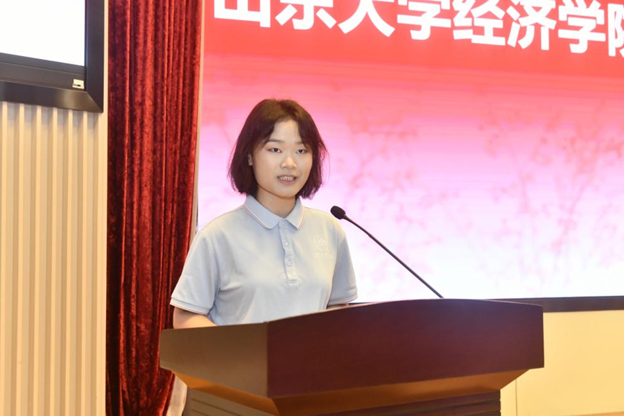 班主任代表徐欣祯结合自身成长经历向新生分享了珍惜时间、勇于尝试两点感悟,期望同学们学会关爱自己、关爱社会,领悟经济学的社会属性与人文关怀内涵,在理论与现实中践行经世济民的责任与担当。