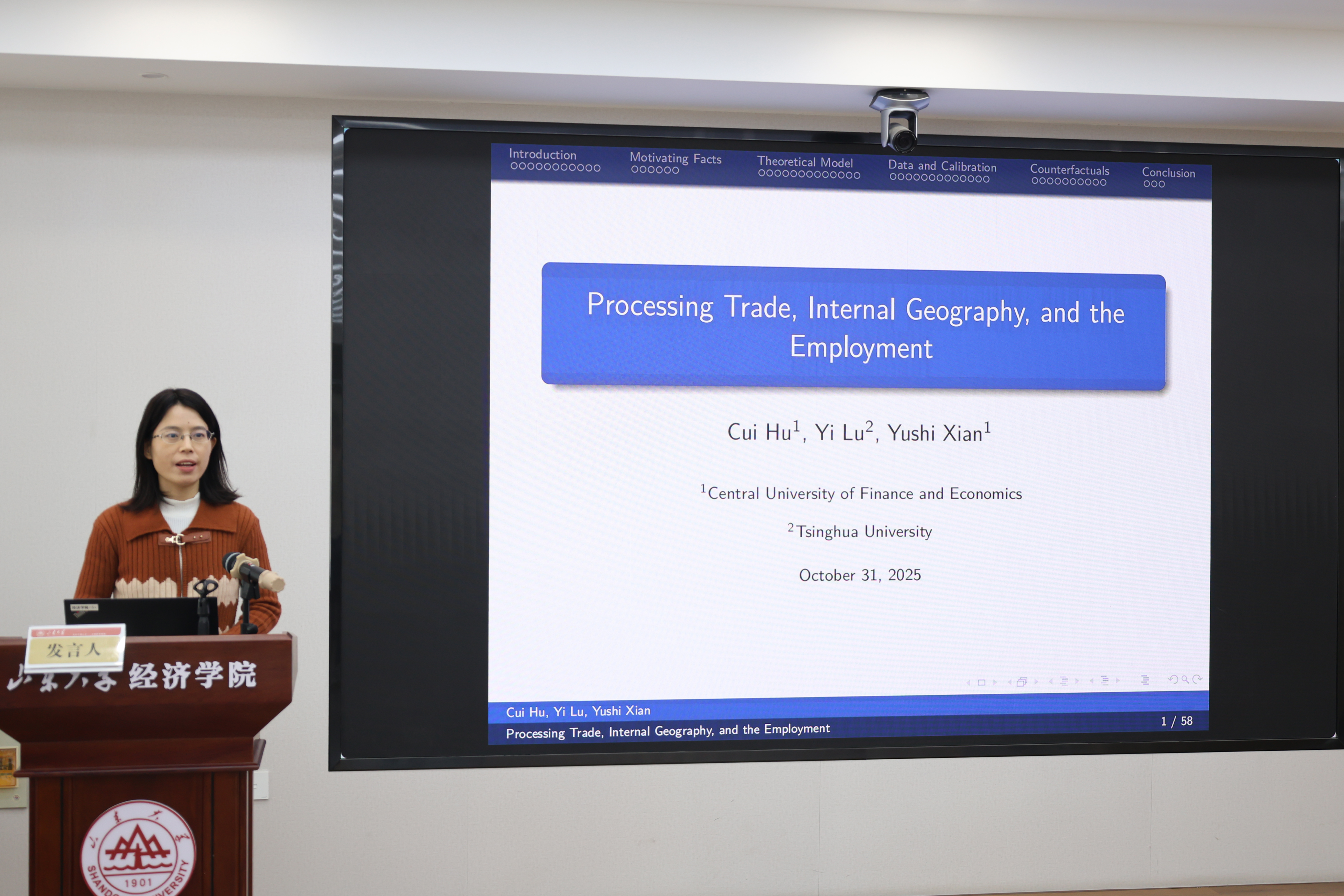主旨报告第二单元由tyc41183太阳成集团綦建红教授主持。中央财经大学国际经济与贸易学院胡翠教授作题为“Processing Trade, Internal Geography, and the Employment”的报告,聚焦加工贸易“不完全贸易自由化”的属性,结合国内地理空间差异,阐述其对就业规模及地区就业分布的影响机制。她指出,加工贸易不仅对就业具有显著支撑作用,还能缩小地区间就业差距,而允许加工贸易产品内销和降低流动成本能够进一步优化就业市场表现。