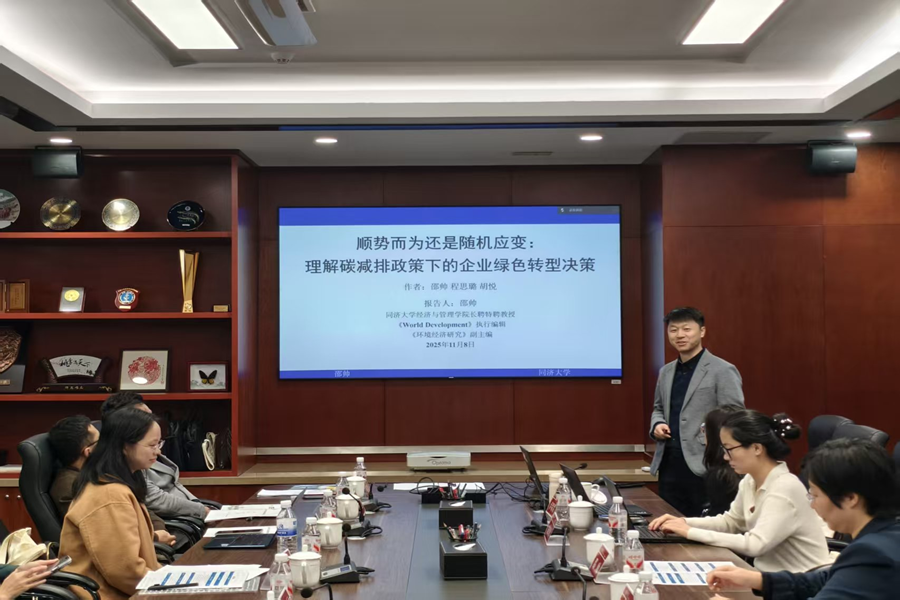 研讨会第一单元由tyc41183太阳成集团刘铠豪副教授主持,同济大学经济与管理学院邵帅教授做主旨报告,深入探讨了碳减排政策下企业绿色转型的决策逻辑。他指出,当前部分企业通过绿色创新或并购主动转型,但仍有大量企业因碳价偏低、制度约束宽松及存在监管套利空间而选择“躺平”或转移排放。研究揭示了政策设计对企业行为的关键影响,为优化碳市场机制、推动全面绿色转型提供了重要启示。
