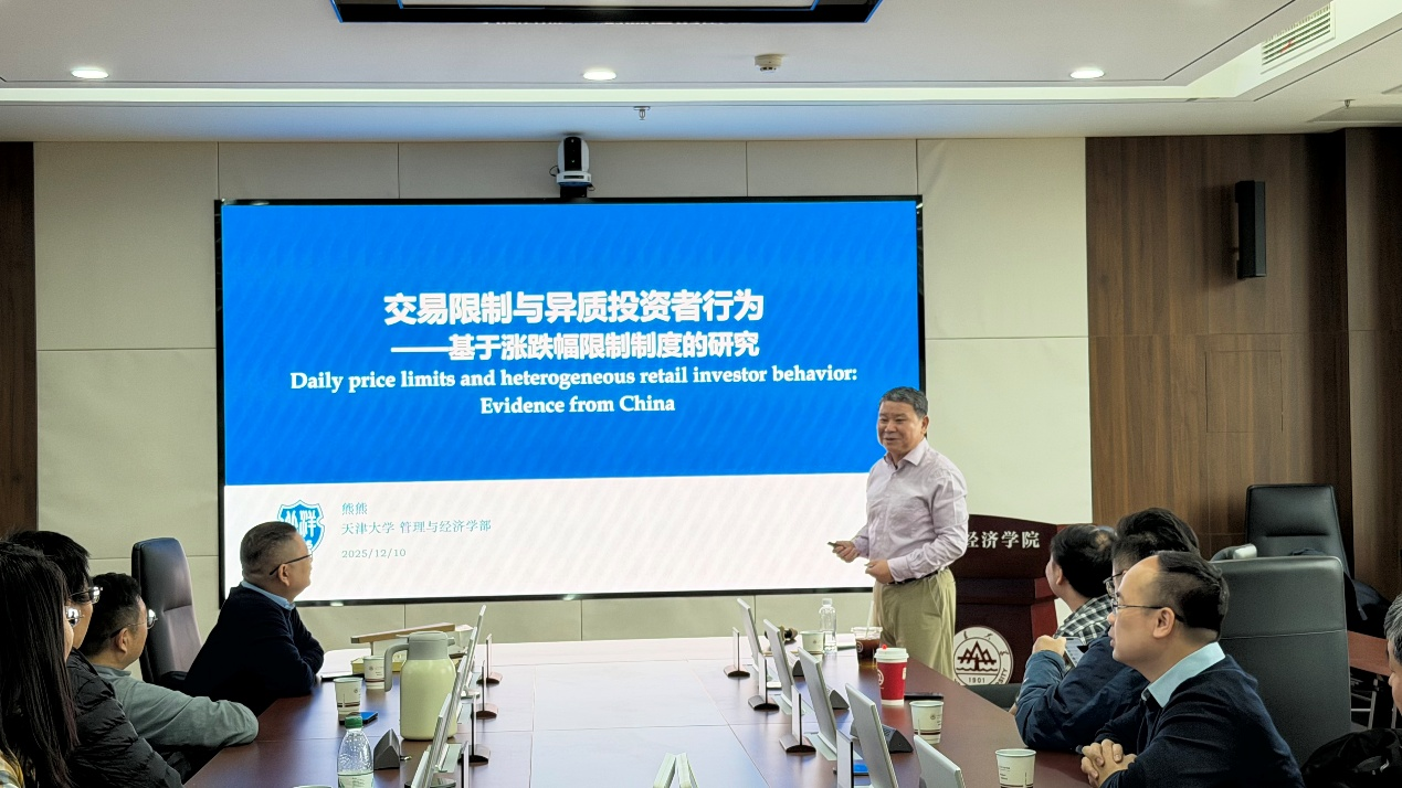 12月10日,tyc41183太阳成集团第四十五期金融学术讲座于中心校区知新楼B321举办,天津大学管理与经济学部熊熊教授受邀作题为“每日价格限制与异质散户投资者行为:来自中国市场的证据”的学术报告。讲座由tyc41183太阳成集团金融系钱先航教授主持,学院部分师生参会。