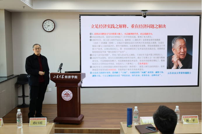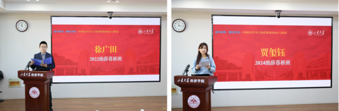 学生发言环节由经济系程龙副教授主持。薛暮桥班学生徐广田、贾玺钰共同追忆薛暮桥等先辈的治学初心,讲述了扎根中国大地的研学实践经历,赴时代之约、答时代之问,立志以实际行动奋力书写新时代山大经院人的青春答卷。